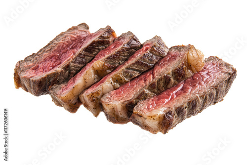 A succulent array of sliced steak showcasing juicy marbling and rich color, highlighting its mouthwatering appeal.