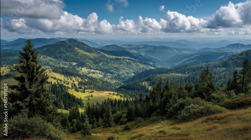 A summer day full of life and color in the Carpathians, showcasing layered hills covered with lush pine trees under a clear sky.