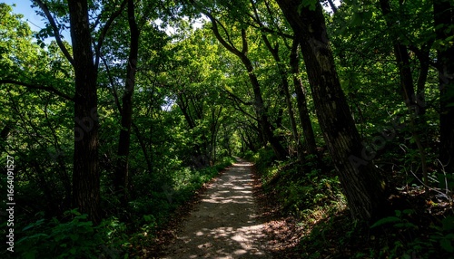 A sun-dappled forest path winds through dense foliage, creating a tranquil and secluded woodland scene.