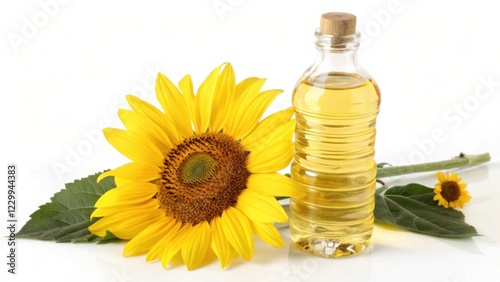 A sunflower with vibrant yellow petals next to a glass bottle of sunflower oil on a white background.