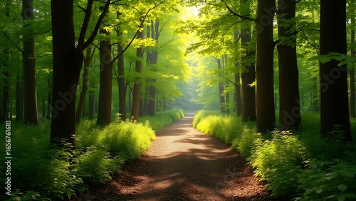 A sunlit path winding through a lush green forest with bright light and tranquil scenery