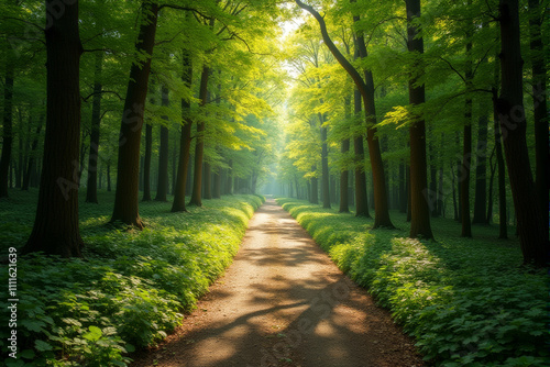 A sunlit path winds through a lush, green forest, with rays of light piercing through the dense foliage. The image evokes a sense of peace, tranquility, and the beauty of nature.