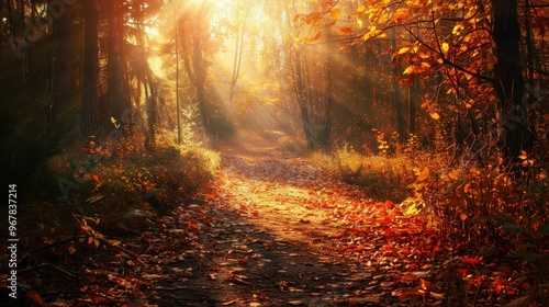 A sunlit path winds through a vibrant autumn forest, dappled with warm light and fallen leaves.