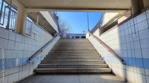 A sunlit stone staircase ascends from a tiled underpass, leading to a bright, outdoor space. The scene offers a sense of transition and upward mobility