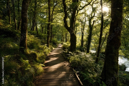 A sunlit wooden path leads through a dense forest bordered by lush ferns and tall trees