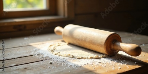 A sunlit wooden table displays a partially rolled dough circle, dusted with flour, beside a well-used rolling pin resting on the surface.