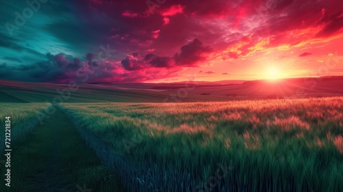 a sunset in green fields captures the essence of nature, intricate landscapes