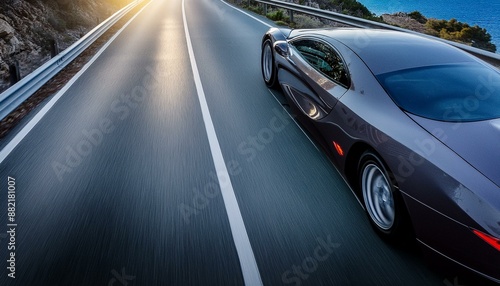 a super car going fast down a highway road with light blurs of speed trailing the car