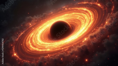 A supermassive black hole at the heart of a dying galaxy, its event horizon consuming light itself, glowing accretion disks spiraling in golden and crimson hues, time warping around it.