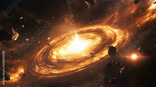 A supermassive black hole with a bright accretion disk, emitting high-energy jets and surrounded by cosmic debris