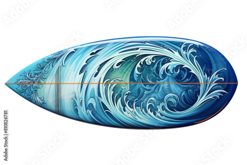 A surfboard with a blue wave design on it. The design is very detailed and intricate. The surfboard is long and narrow, with a blue and white color scheme