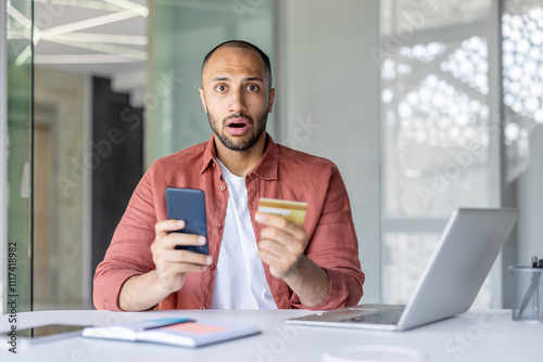 A surprised man is holding a smartphone and a credit card while sitting at a desk. He appears shocked, possibly due to unexpected news or online transaction issues.