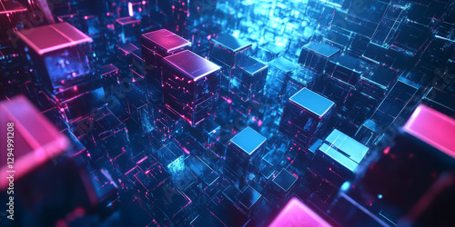 A surreal 3D abstract background showcasing a cybernetic landscape of interconnected glowing cubes. The deep space reflections and neon illumination add depth and a sense of futuristic complexity.