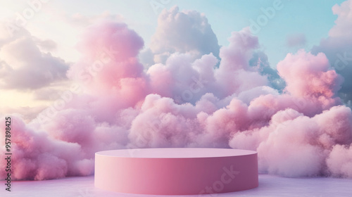 A surreal 3D render featuring a stone podium or table top set against an outdoor backdrop. The scene is bathed in a dreamy atmosphere with a blue sky and soft pastel clouds in gold and pink hues. The