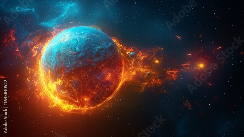 A surreal and dramatic illustration of a planet engulfed in a cosmic blaze of fiery energy and glowing nebulae.