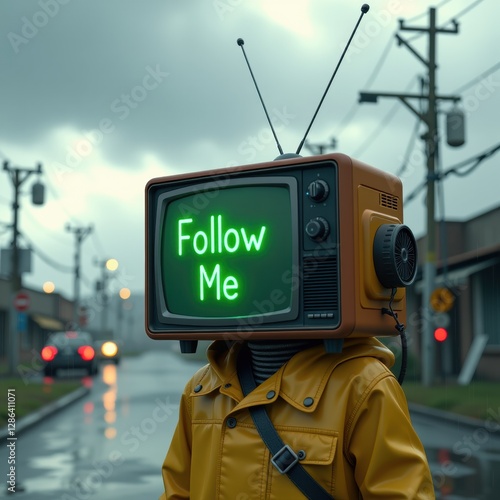 A surreal and futuristic concept art featuring a humanoid figure with a vintage television set for a head, displaying the glowing green text "Follow Me."