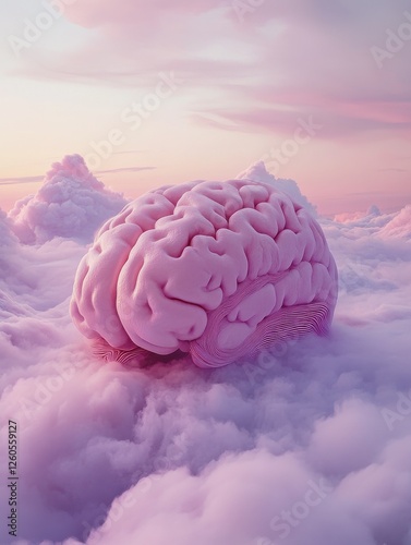 A surreal brain with a dreamy landscape of fog and mist surrounding it, with soft pink and purple hues, neural dreamscape, artistic expression