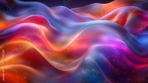 A surreal composition of abstract silk-like material swirling into cosmic patterns, iridescent colors shimmering