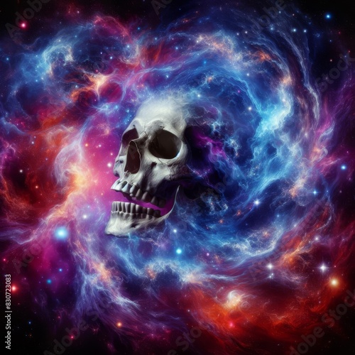 A surreal digital art piece featuring a skull engulfed in a vibrant, swirling cosmic nebula, symbolizing mystery and the unknown.. AI Generation