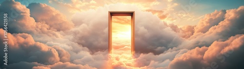A surreal doorway in the sky opens to a vibrant sunset, surrounded by soft clouds, inviting mystery and wonder.