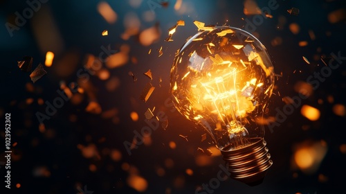 A surreal eureka moment where a lightbulb shatters, releasing virtual particles that form outlandish digital landscapes, Avant-garde, Sci-fi, Glowing Effects, 3D Render
