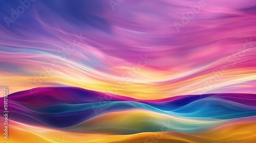 A surreal landscape of smooth, colorful hills with a vibrant sky swirling in abstract patterns.