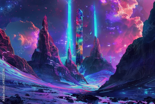 A Surreal Landscape With Glowing Towers and Cosmic Clouds