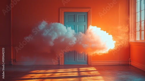 A surreal room with an orange wall, a blue door, and a cloud floating through it.