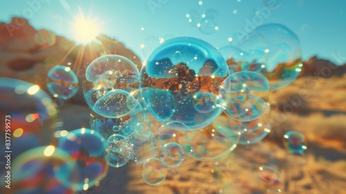 A surreal scene of a person blowing bubbles that reflect distorted images of a desert landscape, creating an illusion of water and greenery in the arid environment.