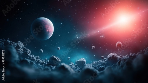A surreal scene of a spaceship traveling through a field of asteroids, with distant planets and stars illuminating the darkness.