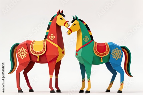 A surreal, simple 3d artwork of a Stylized geometric couple horse with golden patterns and festive colors, modern Asian art, white background
