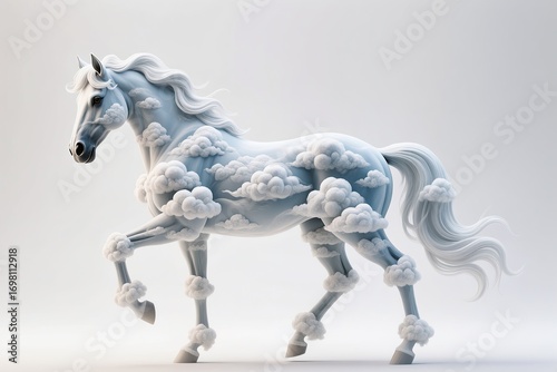 A surreal, simple 3d artwork of an Abstract horse made of swirling clouds, Asian fantasy art, and a white base