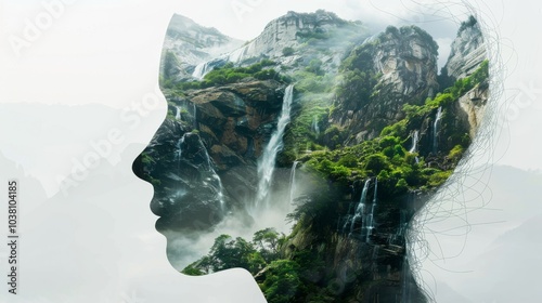 a surrealistic landscape emerging from the contours of a human face, with towering mountains and cascading waterfalls flowing seamlessly into the features