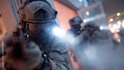 a SWAT team mid-action breaching a door inside a dimly lit building, tactical gear and helmets with visors, aiming rifles with flashlights.