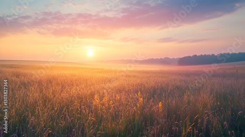 A sweeping prairie at sunrise with gentle wild grasses and pastel skies