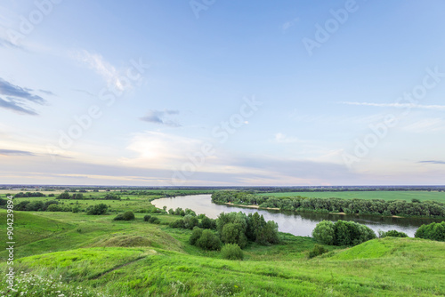 A sweeping view of a meandering river flowing through a verdant valley. The landscape is bathed in the soft glow of an evening sunset, with a clear sky above.