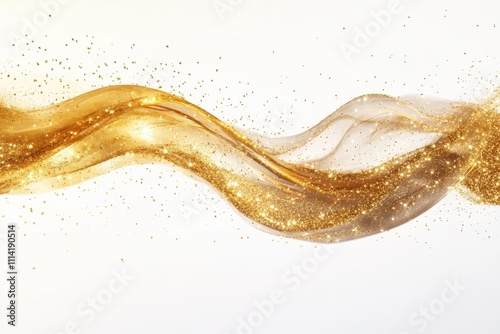 A sweeping wave of golden particles and glitter against a clean white background