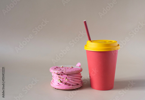 A sweet cake in white and pink colors and a red paper cup with a straw on a light background