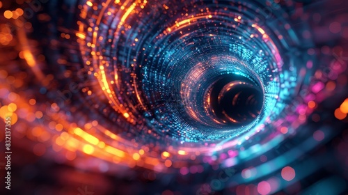 A swirling vortex of neon colors and glowing geometric shapes, background