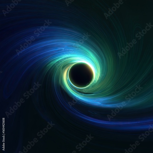 A swirling vortex of teal and blue energy surrounds a central black hole, creating a mesmerizing cosmic scene