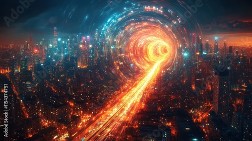 A swirling vortex over a cityscape, merging urban life with cosmic elements.