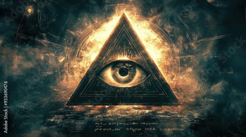 A symbolic representation of the Illuminati pyramid with the all-seeing eye, surrounded by mystical symbols and ancient scripts.
