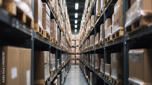 A symmetrical arrangement of metal shelves in a vast warehouse, filled with carefully stacked boxed goods, illustrating organization, efficiency, and readiness for distribution.