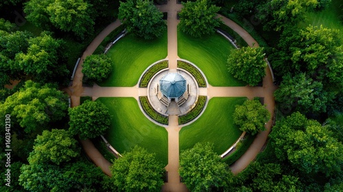 A symmetrical park design with a gazebo at the center.