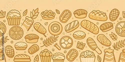 A symphony of golden baked goods, a delectable array of pastries, loaves, and treats, meticulously crafted in a delightful line art style.