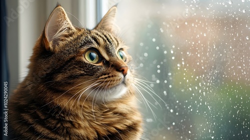 A tabby cat sits comfortably by a window gazing out at the rain with a pensive thoughtful expression The cozy peaceful ambiance creates a serene calming mood