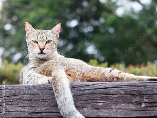 a tabby cat with a scruffy appearance, contorted to groom itself on a wooden bench. Its head is down, focusing on its back, with a blurred outdoor background.