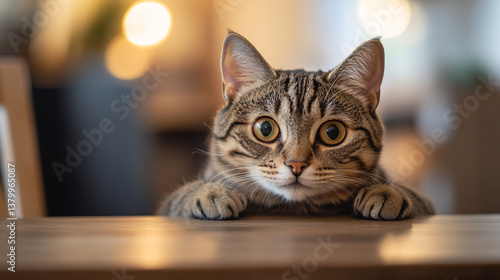 A tabby cat with big eyes peering over the edge of a wooden table looking directly at the viewer