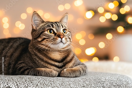 A tabby cat with bright eyes rests on a soft surface, gazing intently at warm, festive lights in the background