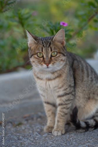 A tabby cat with striking green eyes and a striped coat sits calmly outdoors, gazing directly at the camera with an intense and curious expression.